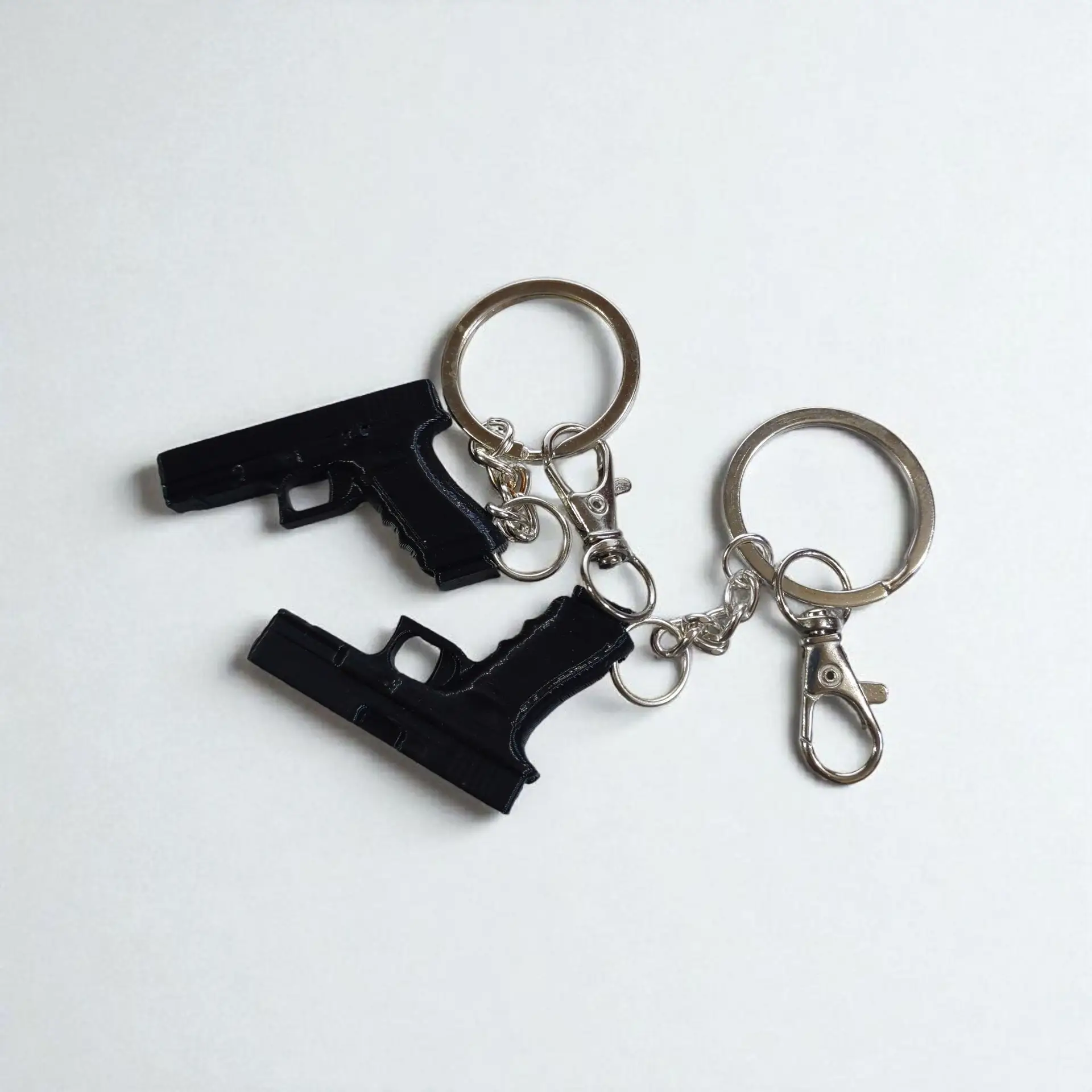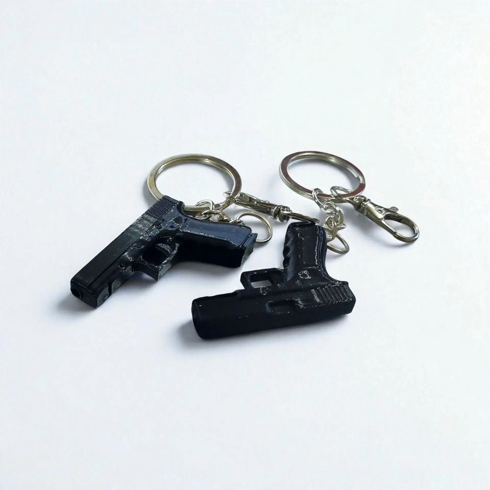 Make a statement with this combo set of 2 mini gun keychains, 3D printed in sleek matte black. Each keychain features a realistic miniature gun design (non-functional) and comes equipped with a durable lobster lock – making it easy to clip on keys, bags, or zippers. Lightweight, edgy, and fun – perfect for gifting or personal use.